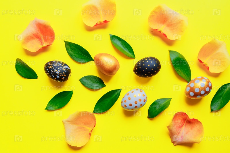 Праздничный пасхальный фон. Золотые, черно-белые стильные пинты с листьями и лепестками роз на желтом фоне