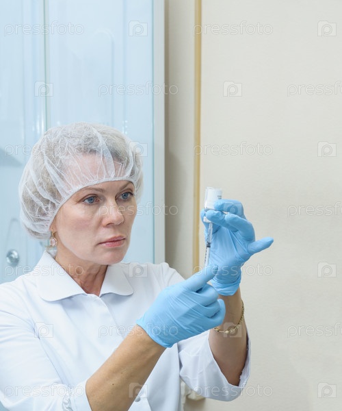 Женщина-косметолог в медицинской шапочке и синих латексных перчатках держит шприц с инъекцией