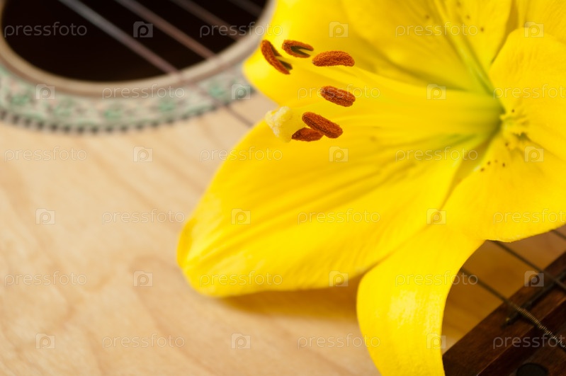 Желтая лилия лежит на деке гитары