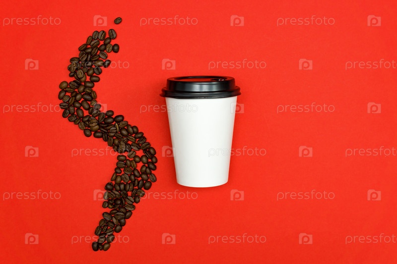 Вид сверху на одноразовую кофейную чашку из белой бумаги на красном фоне с кофейными зернами
