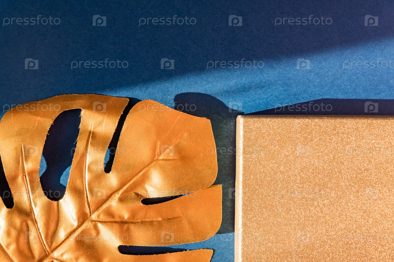Модный роскошный синий фон с золотым листом монстера. Скопируйте место для текста