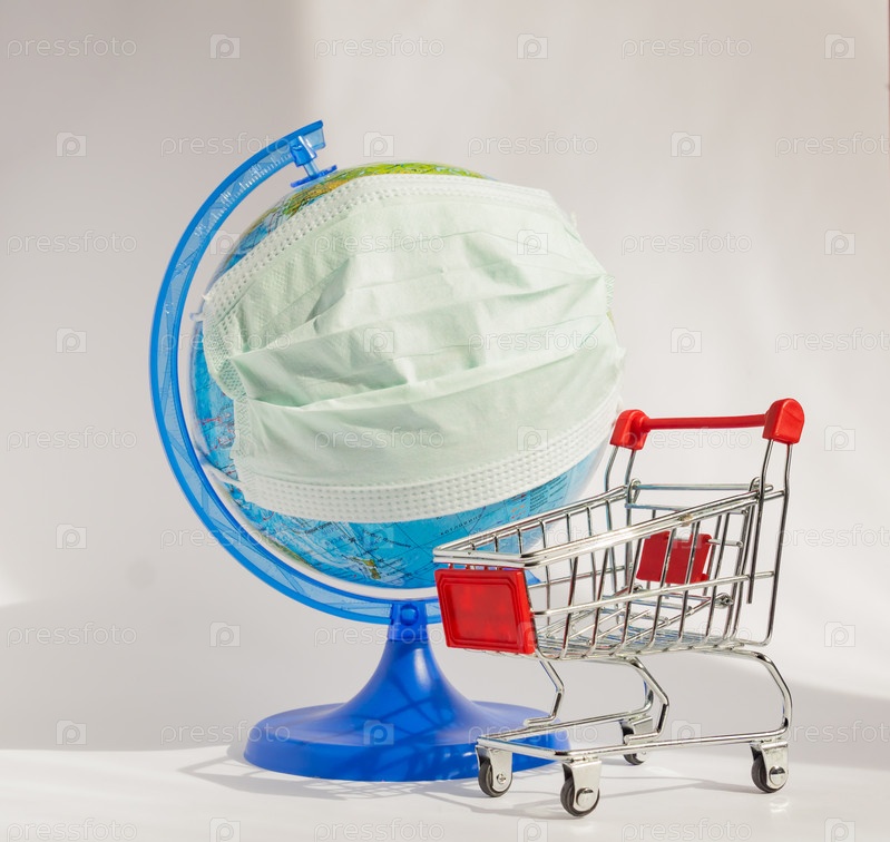 Вспышка коронавируса. Мировая пандемия. Глобус в медицинской маске и тележка для покупок на белом фоне. Концепция онлайн-покупок во время covid-19