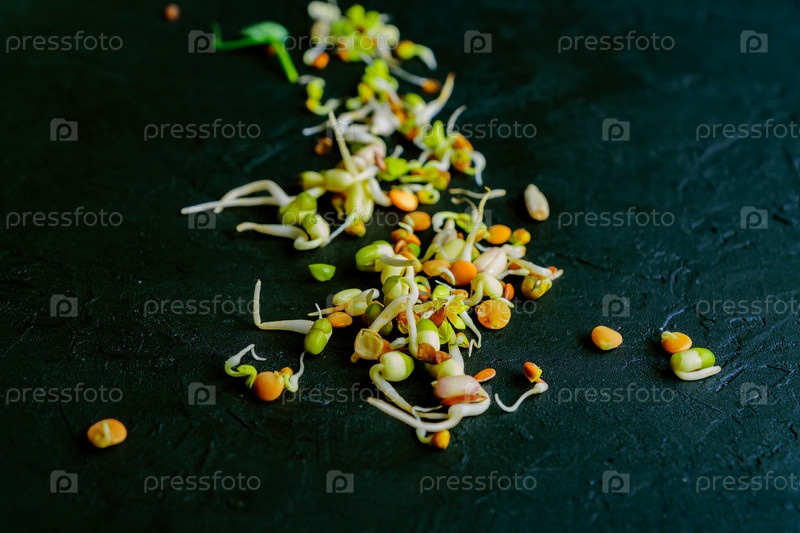 Пророщенная чечевица, фасоль, маш, горох, редис, лен, подсолнух на черном фоне. веган, сыроедение, избирательный подход