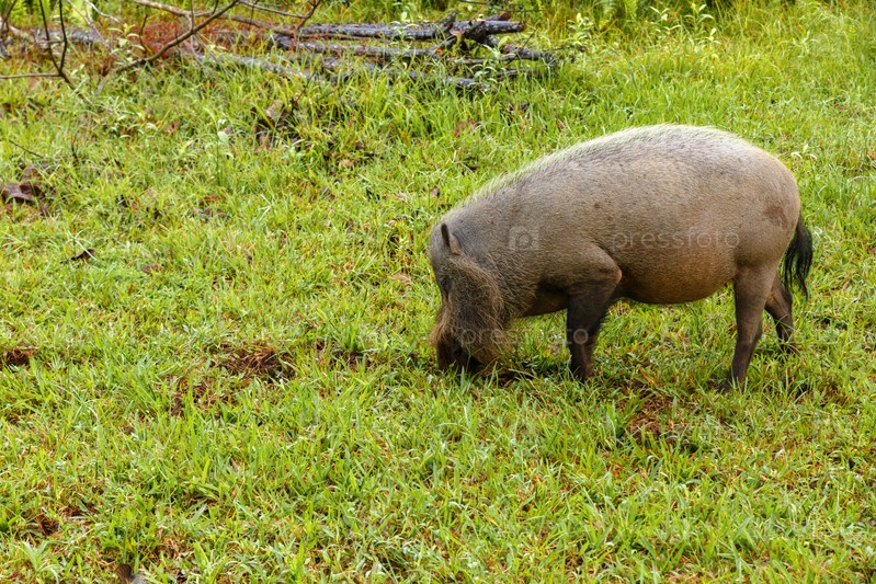 Бородатая свинья копает землю на зеленой лужайке в джунглях