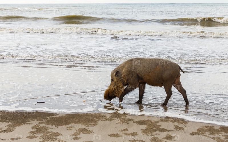 Бородатая свинья на пляже в Национальном парке Бако, Саравак, Малайзия