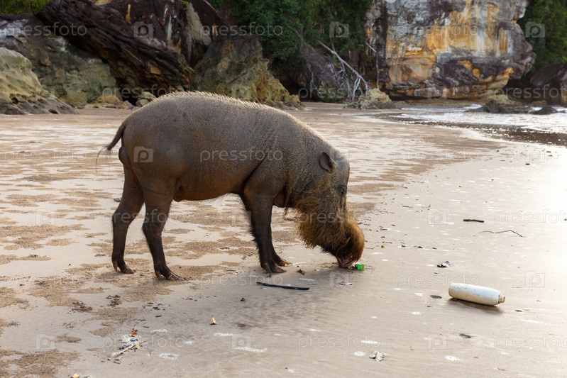 Бородатая свинья гуляет по пляжу у моря