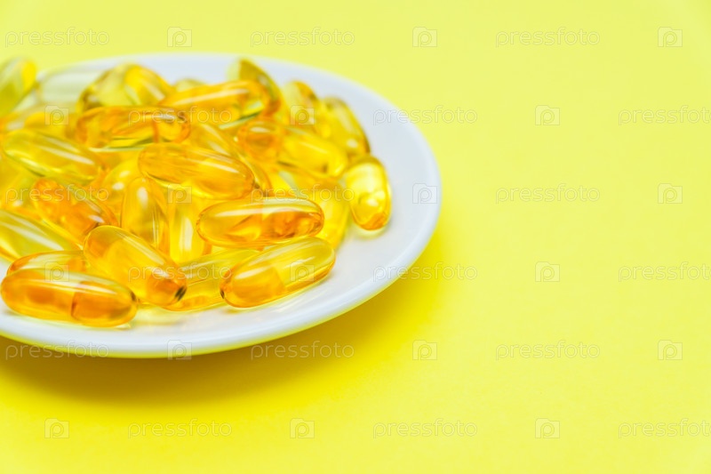 Белая тарелка с капсулами рыбьего жира на желтом фоне с копией пространства
