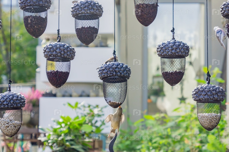 Подвесные кормушки для птиц в форме желудя, наполненные разным зерном в городе