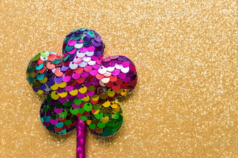 Цветок из блесток на сверкающем золотом фоне. Минимальная плоская планировка, пространство для копирования