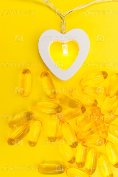 Гелевые капсулы с рыбьим жиром омега-3 на желтом фоне с гирляндой в форме сердца с включенным светом. Концепция здравоохранения