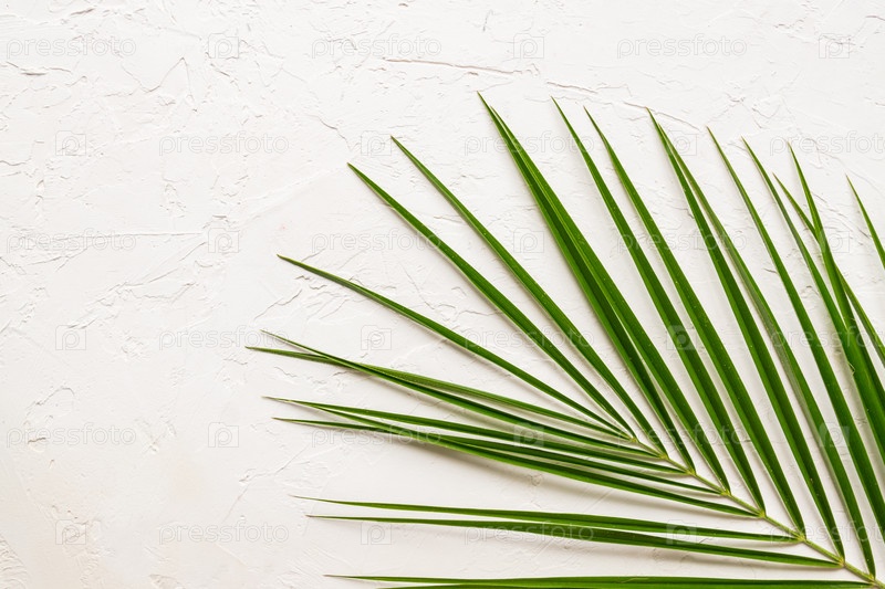 Тропический зеленый пальмовый лист на белом бетонном фоне. Плоская планировка, вид сверху