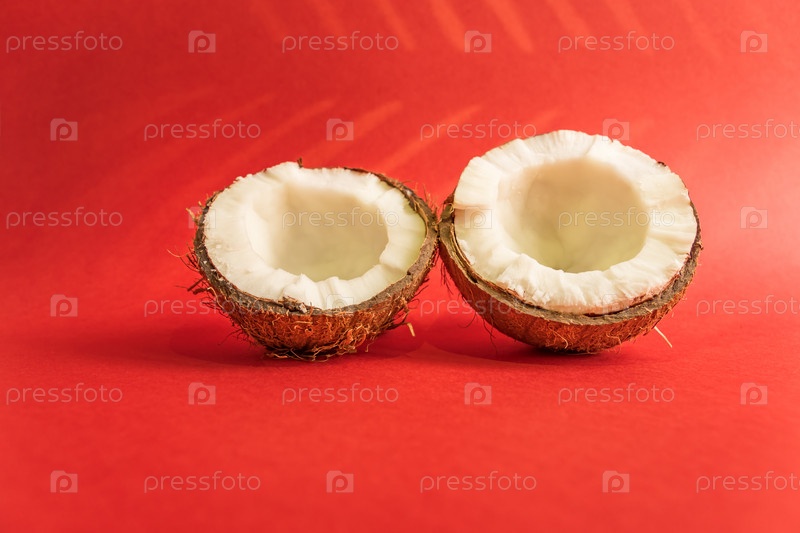 Две половинки свежего сырого кокоса на красном фоне