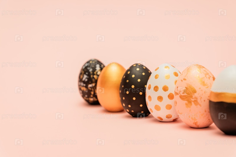 Розовые, белые, черные и золотые украшенные пасхальные яйца подряд на розовом фоне. Модный праздничный фон с копией пространства