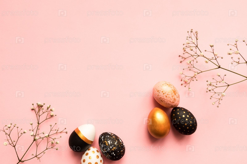 Вид сверху на деревянные крашеные яйца золотого, черного и розового цветов с веткой гипсофилы на розовом фоне. Счастливой пасхи фон с копией пространства