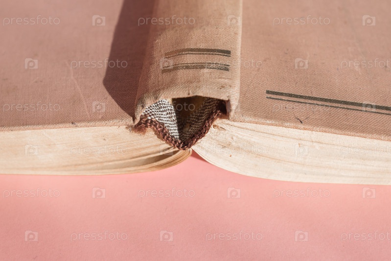 Откройте старую книгу в твердом переплете на розовом фоне с копией пространства. Образовательная концепция