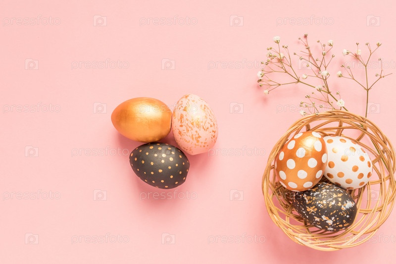 Вид сверху на деревянные крашеные яйца золотого, черного и розового цветов с веткой гипсофилы на розовом фоне. Счастливый пасхальный фон