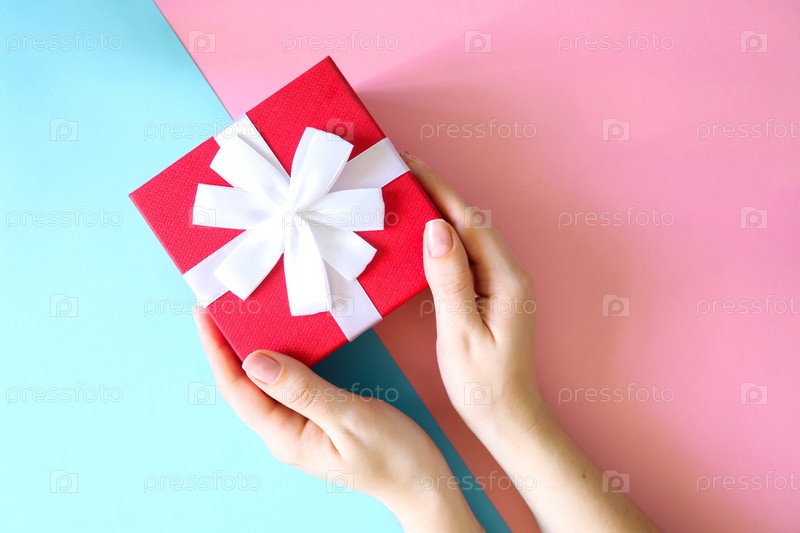 Женщина держит красную подарочную коробку на синем и розовом фоне. Праздничная открытка. Концепция праздника