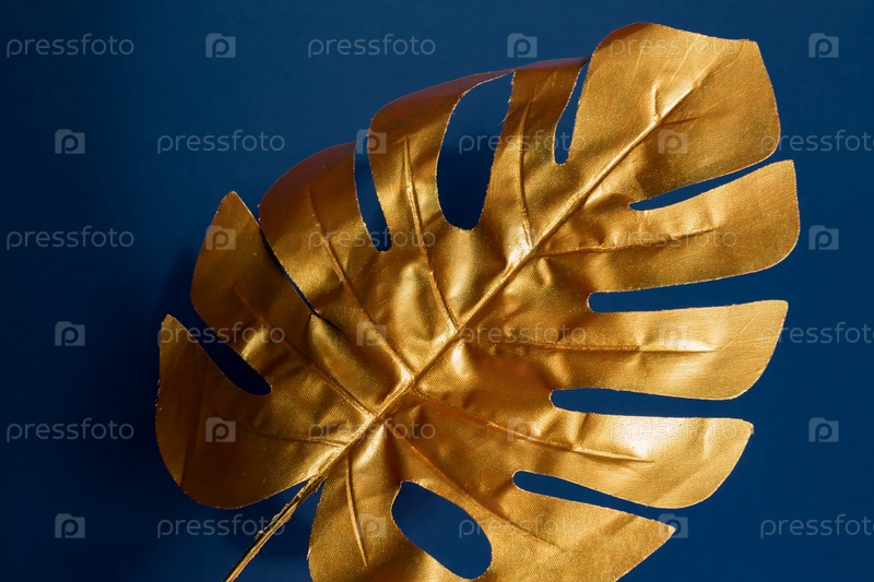 Модный роскошный синий фон с золотым листом монстера