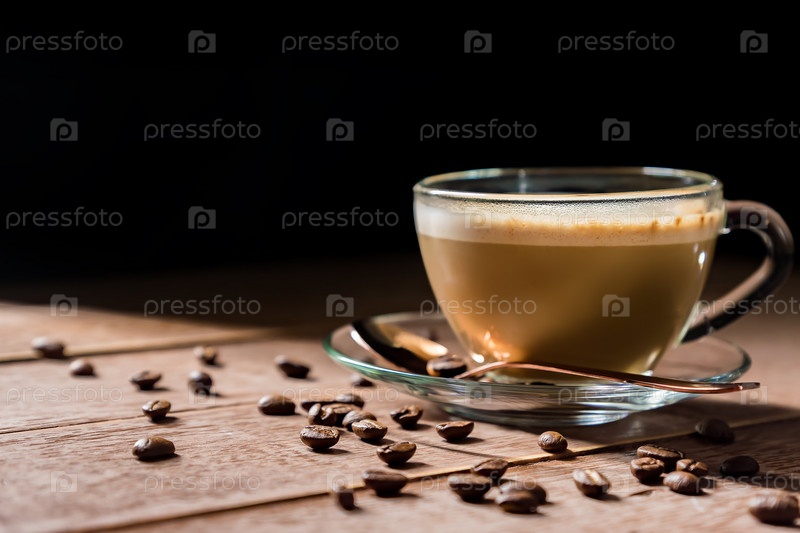Чашка горячего кофе с молоком на темном фоне. латте или капучино на деревянном столе с копией пространства
