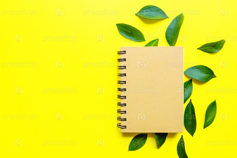 Креативная плоская композиция с пустым блокнотом и красивыми листьями эвкалипта на желтом фоне. Шаблон поздравительной открытки. Концепция спасения планеты
