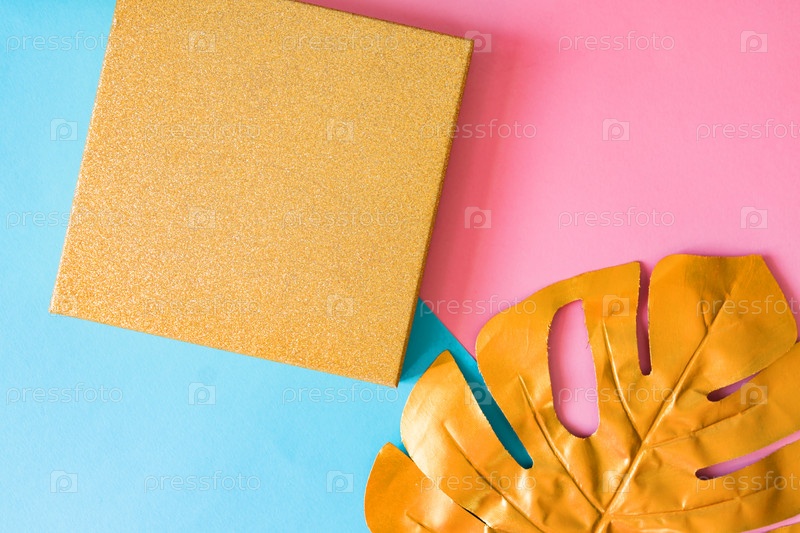 Вид сверху на золотую подарочную коробку и лист монстера на двойном розовом и синем фоне. Минимальная плоская планировка, креативный фон