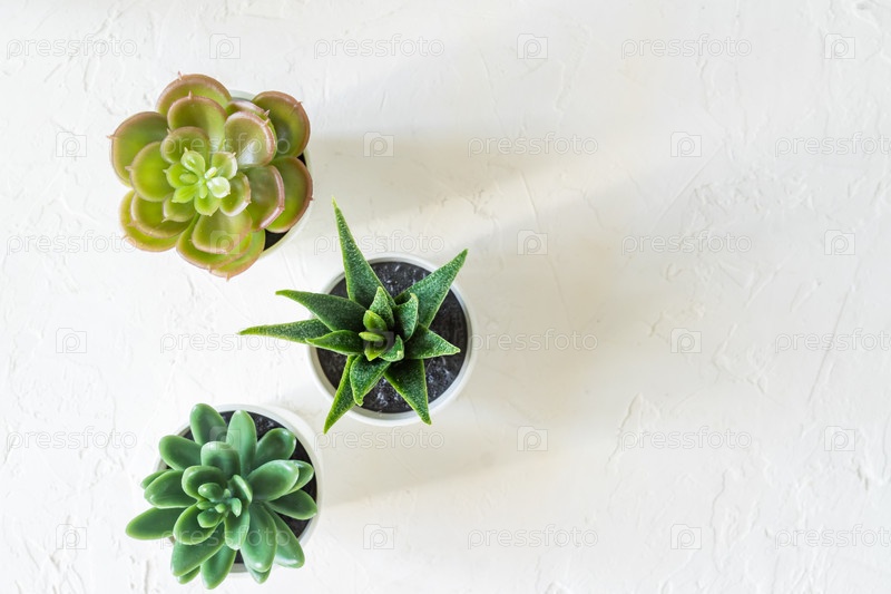 Вид сверху на различные маленькие кактусы в белых горшках на бетонном фоне. дизайн интерьера. Копировать пространство