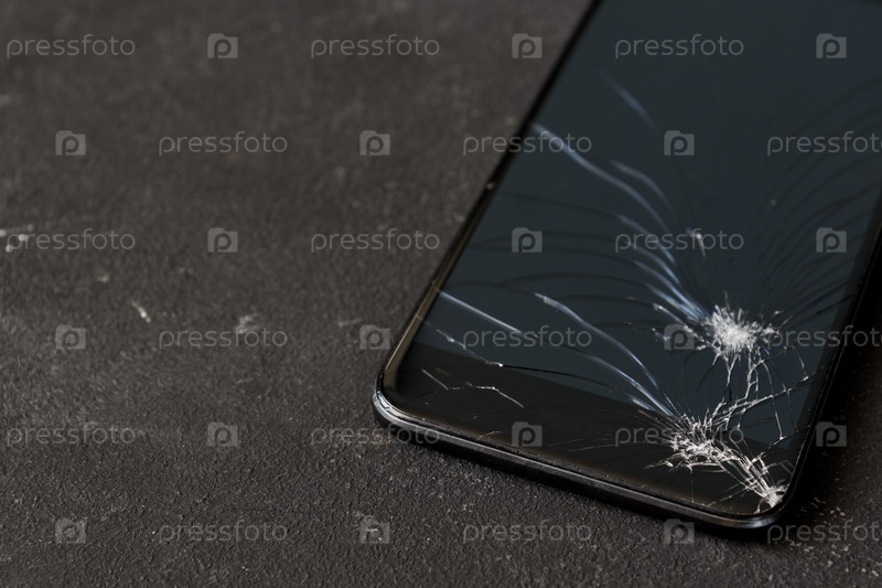 Разбитое стекло черного смартфона на темном фоне. Выборочный фокус. Копировать пространство