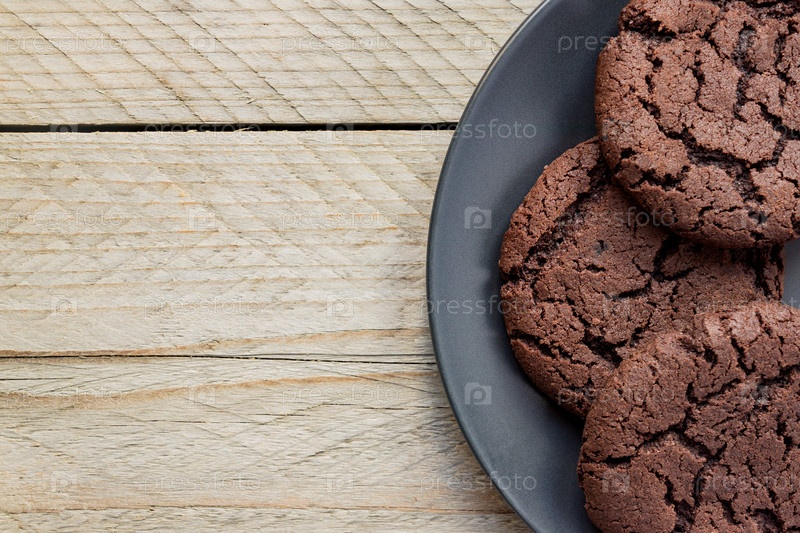 Вид сверху, печенье с шоколадной крошкой на черной тарелке. деревянный фон. Сверху. копировать пространство
