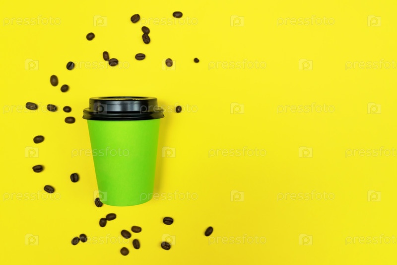 Закройте чашку кофе на ярко-желтом фоне. Эко концепция. Место для текста