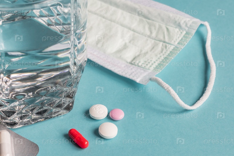 Лечение вирусной пандемии. Медицинская маска, таблетки и стакан воды на синем фоне. Коронавирус 2019, нКоВ