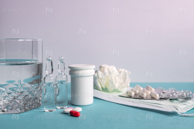Лечение вирусной пандемии. Лекарства, капсулы и стакан воды. Концепция здравоохранения
