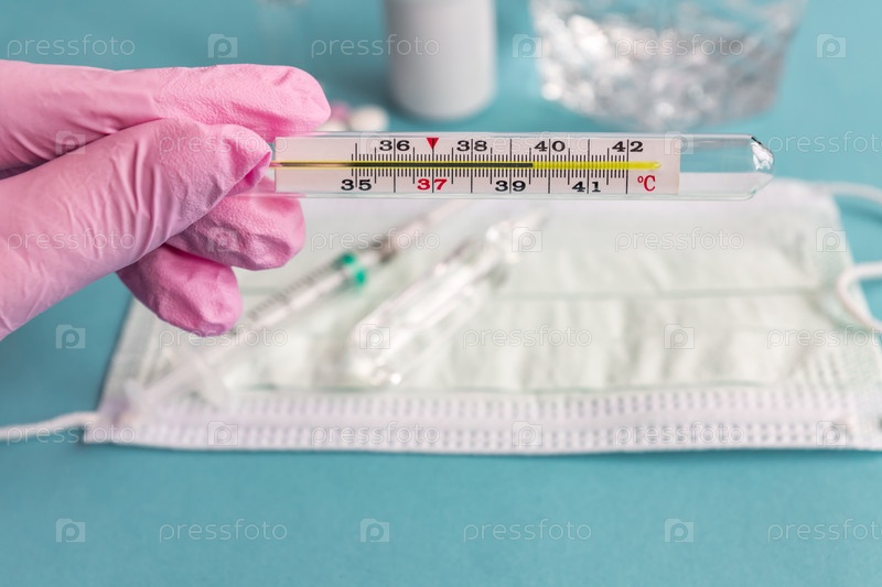 Врачи вручают розовую латексную перчатку с термометром, показывающим высокую температуру. Концепция здравоохранения и медицины