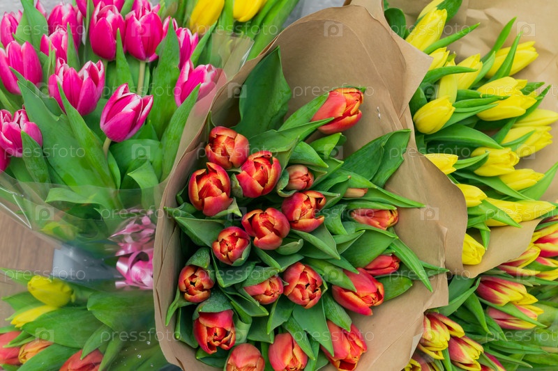 Многоцветные цветущие тюльпаны для продажи в цветочном магазине. Вид сверху