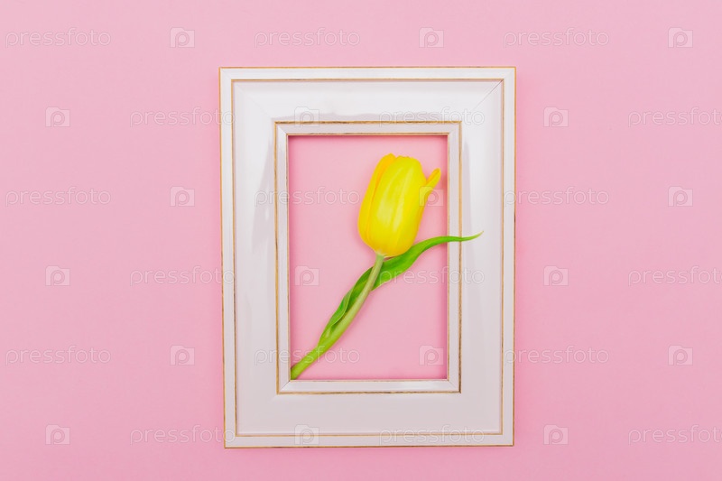 Желтый тюльпан в розовой рамке на пастельном фоне. Креативный макет с цветами и фоторамкой. Весенняя минимальная концепция
