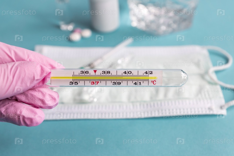 Врачи вручают розовую латексную перчатку с термометром, показывающим высокую температуру. Концепция здравоохранения и медицины