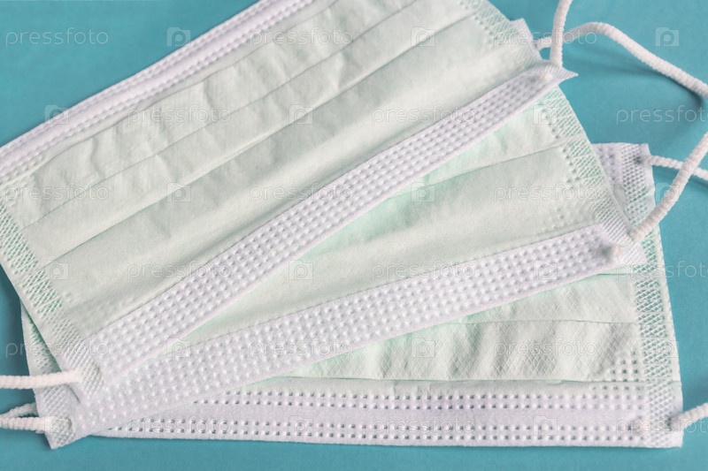 Крупный план трех медицинских масок на синем фоне. Защитное здоровье