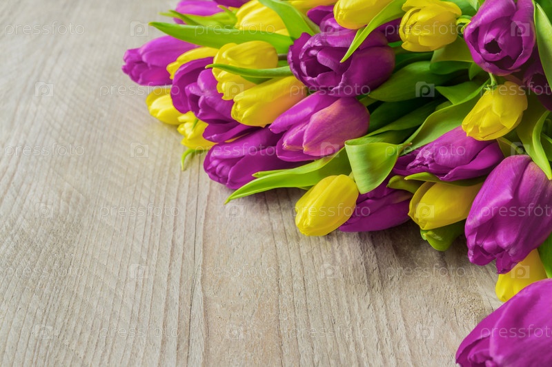 Праздничная открытка с букетом цветущих фиолетовых и желтых тюльпанов. Весенний фон с копией пространства