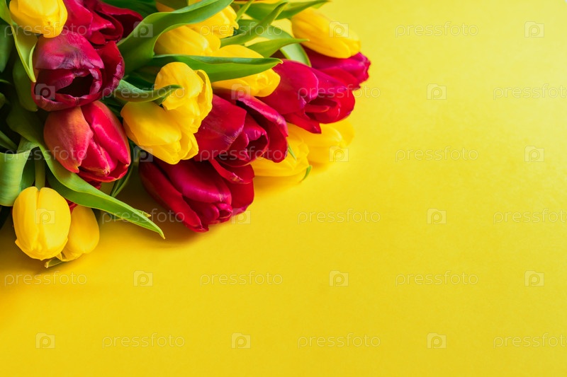 Букет цветущих желтых и красных тюльпанов на желтом фоне. Место для текста, без изображения