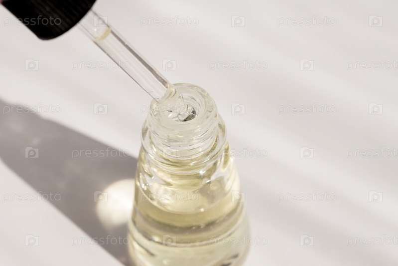 Макет стеклянной бутылки капельницы. Косметическая пипетка сыворотки на белом фоне