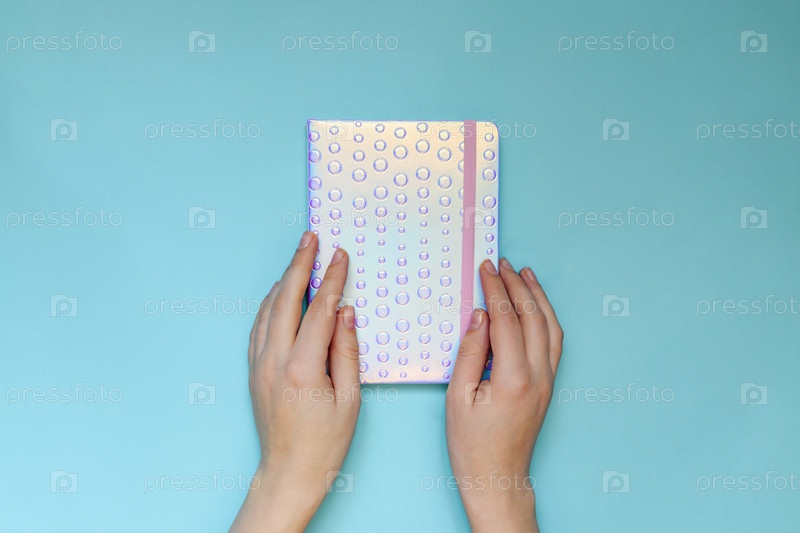 Женские руки держат блокнот с модной голографической обложкой на синем фоне. Концепция планирования. Плоский стиль