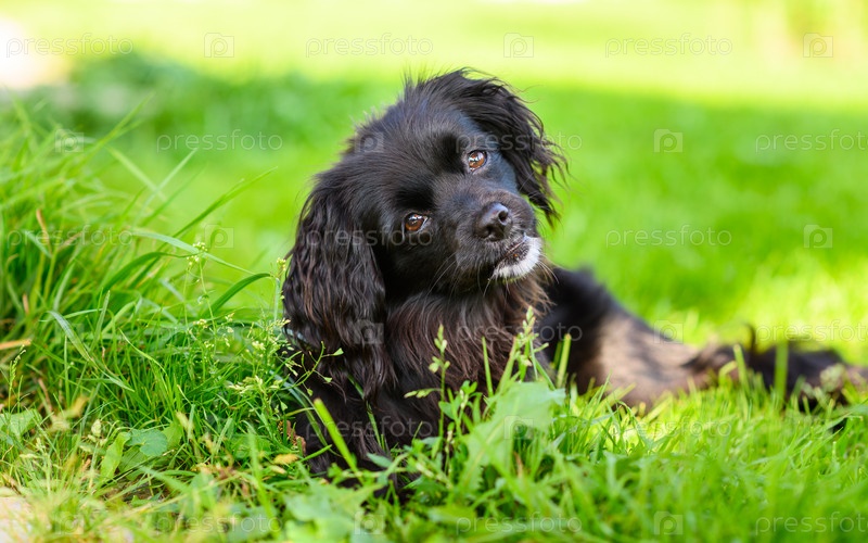 Смешная собака с опущенной головой внимательно смотрит в камеру и слушает команды