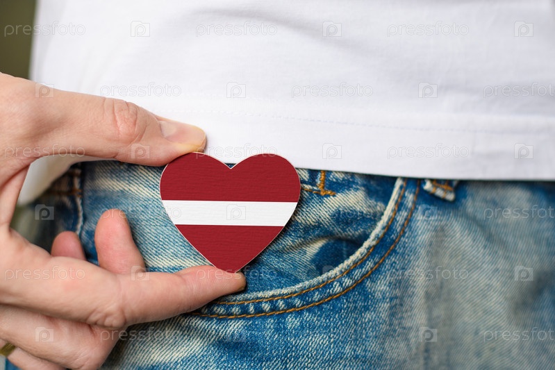 Патриот Латвии! Деревянный значок с латвийским флагом в форме сердца в мужской руке