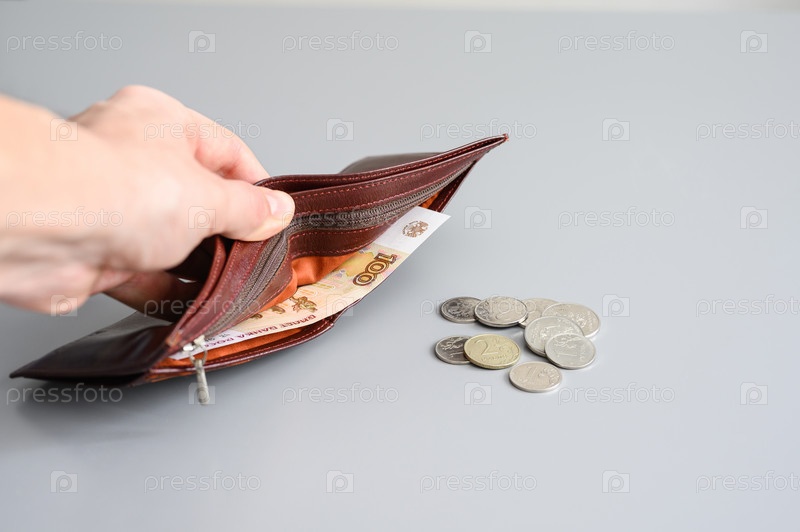 Мужчина показывает бумажник с российскими рублями. Понятие и расчет бедности в России. Селективный фокус на бумажном счете