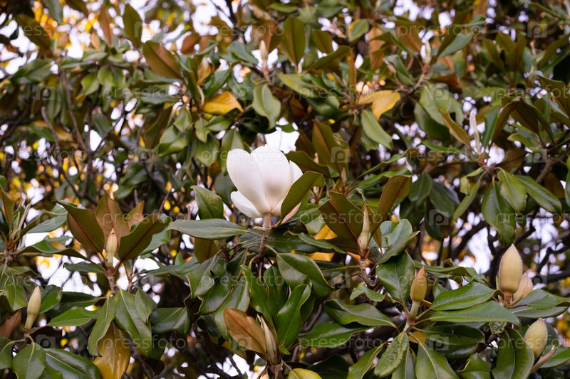 Ветви дерева магнолии крупноцветковой с цветами