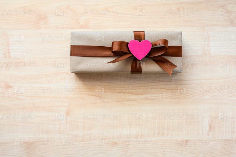 Подарок и розовое сердце на деревянном столе. Вид сверху, выборочный фокус на сердце