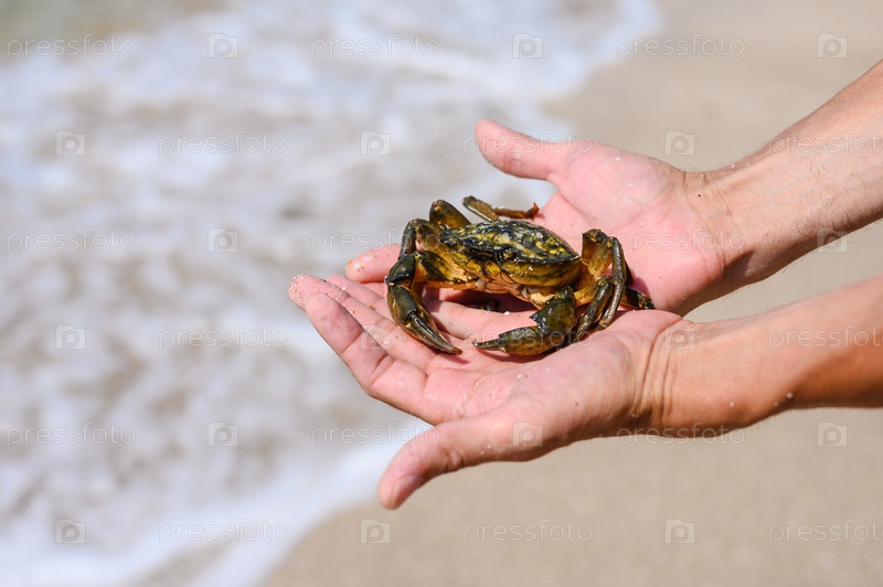 Огромный пойманный краб в мужских руках на фоне морского берега и волн