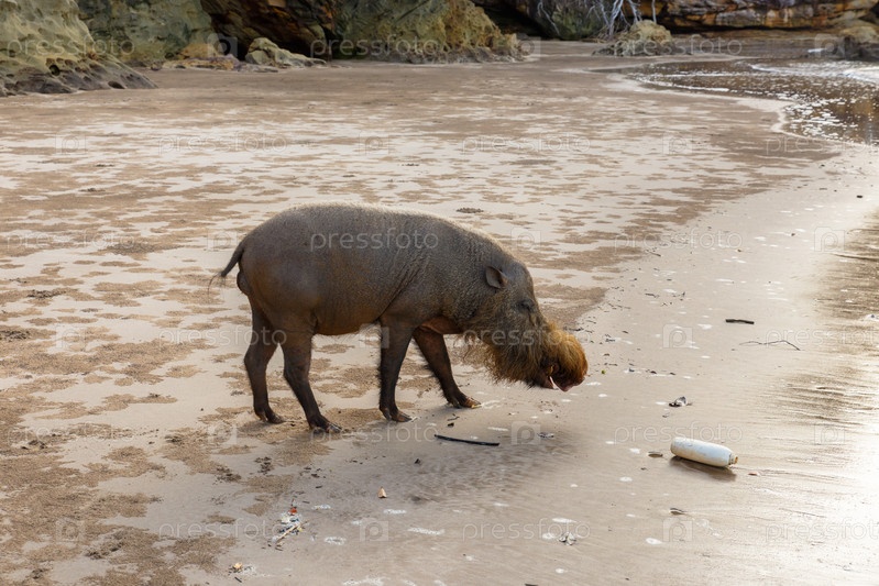 Бородатая свинья гуляет по пляжу у моря