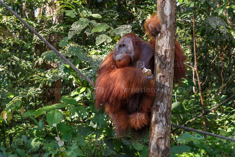 Самка орангутанга сидит на веревке возле дерева и смотрит в сторону