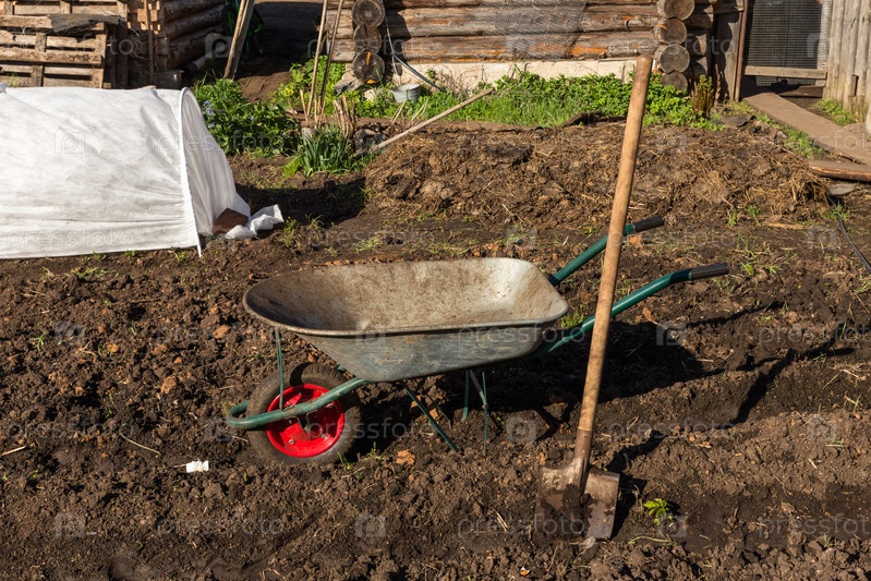 Садовая тележка и лопата в саду