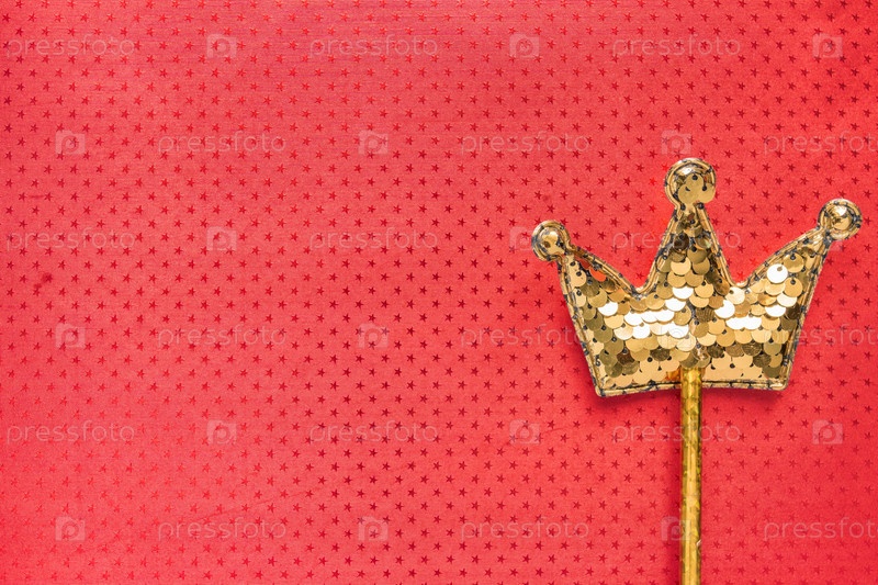 Золотая волшебная палочка из блесток в форме короны на красном фоне. Креативная квартира в минималистском стиле. Скопируйте место для текста
